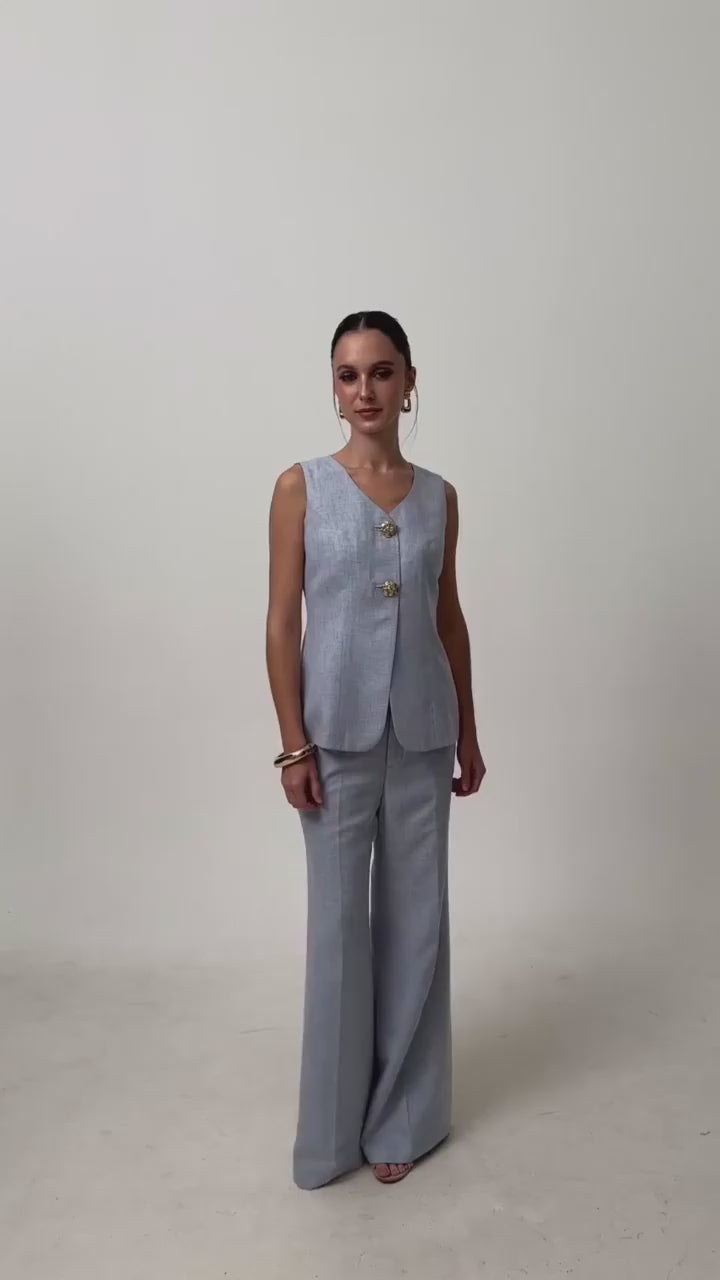 Top: Sleeveless V-neck with decorative front buttons and subtle front slit